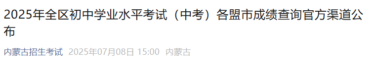 【 2025年内蒙古全区初中学业水平考试(中考)各盟市成绩查询渠道公布】易学网从内蒙古招生考试公众号了解到,2025年内蒙古全区初中学业水平考试(中考)各盟市成绩查询渠道公布,相关事宜详情如下: